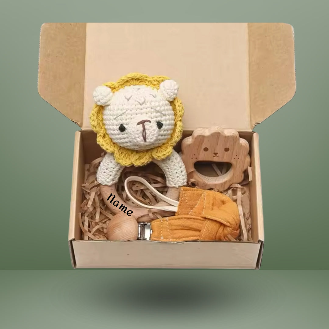 Handgemachtes Baby-Rassel-Set aus Naturholz – Individuell mit Gravur, Löwe